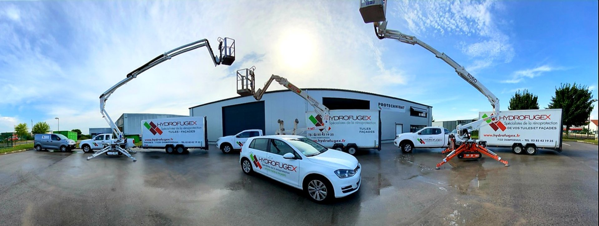 Grâce à l’utilisation de mini-nacelles, Hydrofugex réalise ses interventions rapidement, en toute sécurité sans marcher sur la toiture, sans les complications et coûts liés à la pose d'un échafaudage.